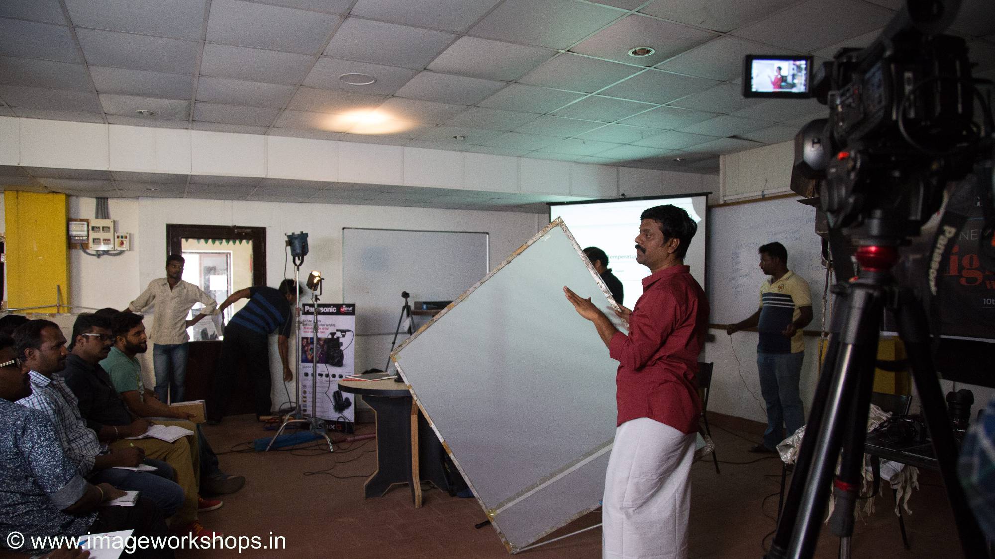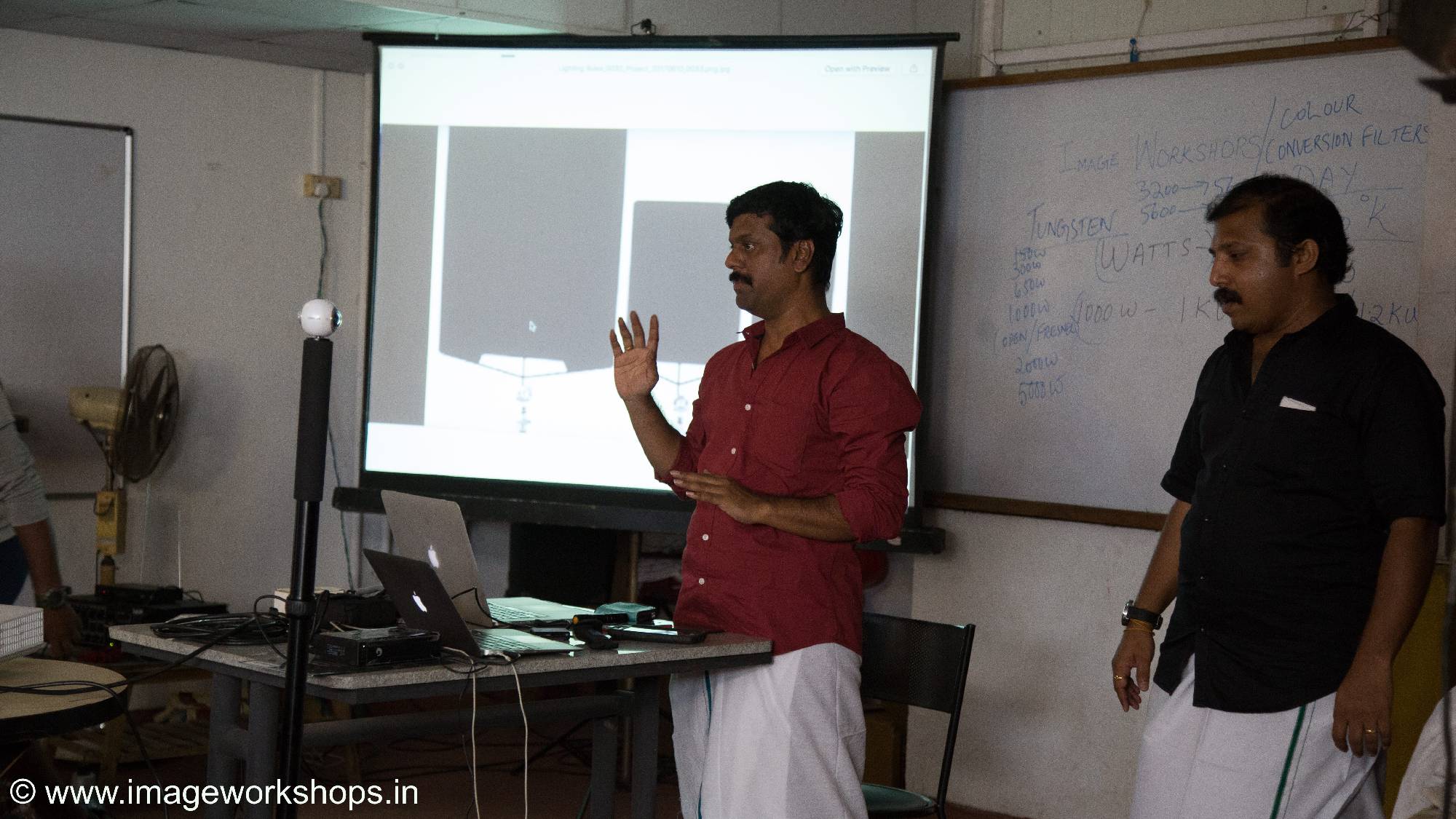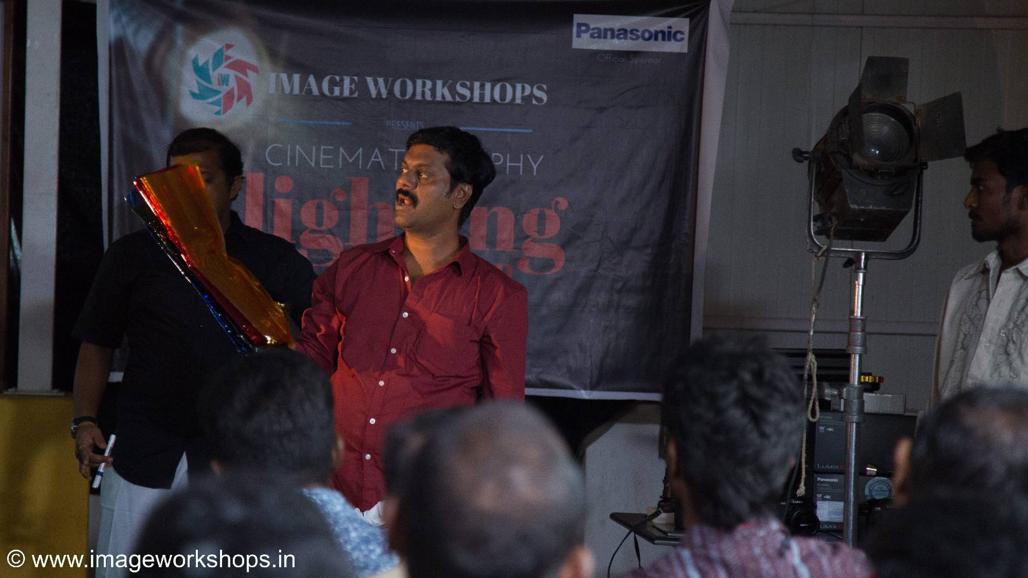திரைத்துறையில் பயன்படுத்தும் கருவிகள், விளக்குகள் மற்றும் அதன் வகைகள், ஒளியமைப்பில் பயன்படும் துணைக்கருவிகள், அவற்றைப்பயன்படுத்தும் முறை, என எல்லாவற்றையும் செயல்முறை விளக்கமாக செய்துக்காட்டினோம். ‘Three Point Lighting’ செய்வது எப்படி..? அதை கதையின் தன்மைக்கேற்ப வெவ்வேறு Genre-க்கு பயன்படுத்துவது எப்படி என்பதையும் பார்த்தோம். பின்பு, Single Light Source ஒளியமைப்பை செய்வது எப்படி, அதில் கவனிக்க வேண்டிய முக்கிய அம்சங்கள் யாவை..? அதை நடைமுறையில் எப்படி சாத்தியப்படுத்துவது என்பதை சொல்லிக்கொடுத்தோம்.
